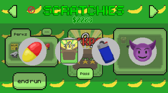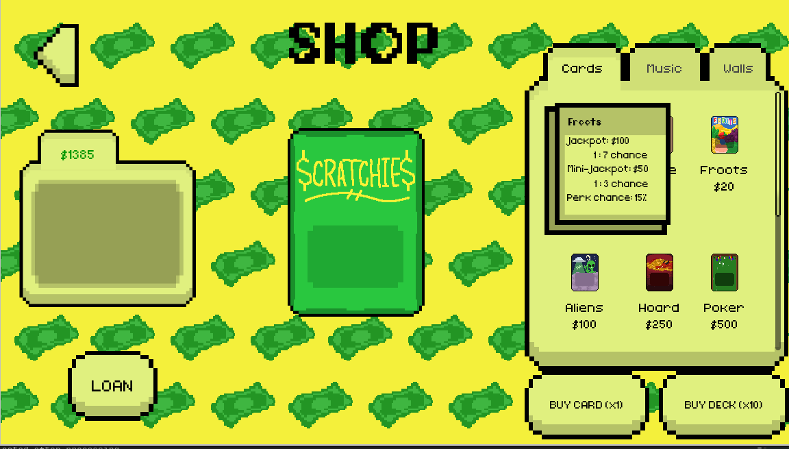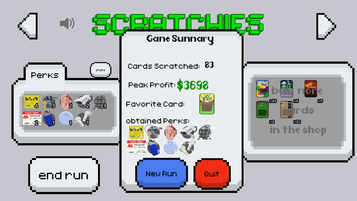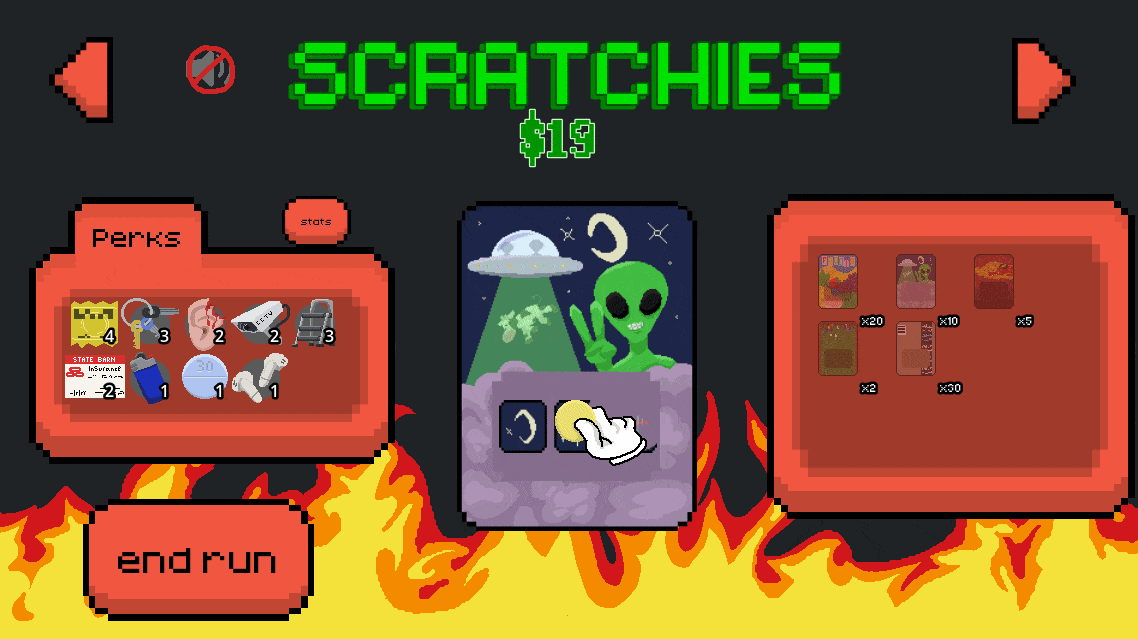 SCRATCHIES is a roguelite lottery scratch-card simulator. Buy a card, scratch it, and try your luck. Win enough and you can reinvest in more lucrative cards, but running out of cash means starting over. Along the way, perks can twist your odds for better or worse.